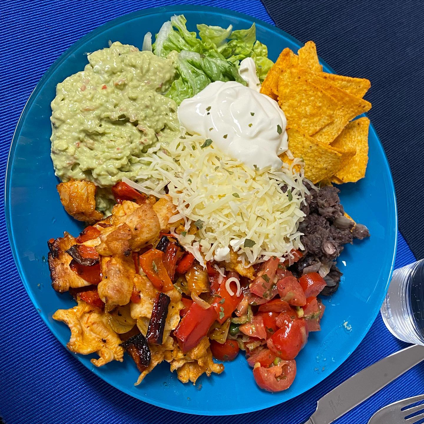 - Damit ihr nichts vergesset: Pico de Gallo, Nachos, Chicken, Salat, Bohnenstampf, und Guacamole. In die Mitte den geriebenen Käse und ein Klecks Creme fraiche sowie etwas vom gehackten Koriander darübergeben und ein Schnitz Limette beigeben.