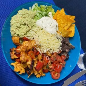 Damit ihr nichts vergesset: Pico de Gallo, Nachos, Chicken, Salat, Bohnenstampf, und Guacamole. In die Mitte den geriebenen Käse und ein Klecks Creme fraiche sowie etwas vom gehackten Koriander darübergeben und ein Schnitz Limette beigeben.