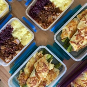Frühlingszwiebel und Paprika in feine Stücke schneiden. In einer Schüssel mit ⅔ des geriebenen Käse und dem Frischkäse verrühren. Mit Salz und Pfeffer abschmecken.
