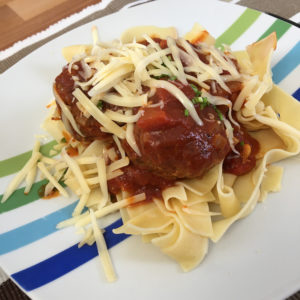 Die Hackbällchen kurz in die Soße legen, in Schälchen mit den Bandnudeln anrichten und mit dem übrigen Schnittlauch bestreuen