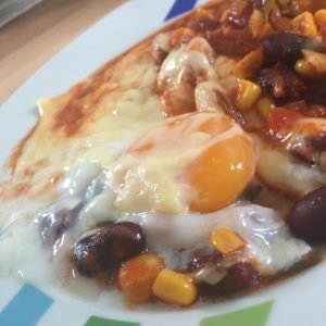 Kurz abschmecken und anschließend die Eier aufschlagen und auf die Masse geben. Etwas Salz auf die Eier und dann den Gauda auf die Eier reiben.